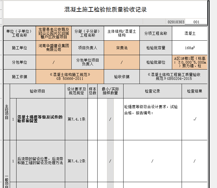 第7.4.1條“檢查記錄”一欄不用填“試驗(yàn)合格與報(bào)告編號(hào)”。報(bào)審時(shí)間可以填施工的時(shí)間或養(yǎng)護(hù)期結(jié)束后的時(shí)間。否則,填了“試驗(yàn)合格與報(bào)告編號(hào)”就要等到報(bào)告合格之后再報(bào)審。