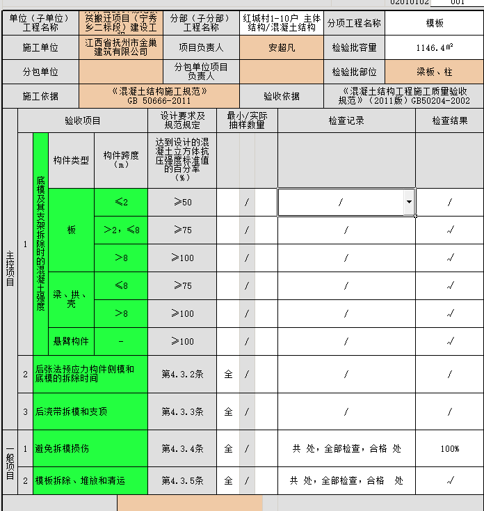 一般項(xiàng)目1項(xiàng)填寫“表面及棱角無損傷”,2項(xiàng)填寫“現(xiàn)場清理整潔,無堆載現(xiàn)象”