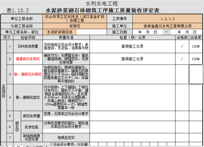 普通砌石體砌筑與墩、墻砌石體砌筑檢驗(yàn)的質(zhì)量標(biāo)準(zhǔn)不同、檢驗(yàn)方法與檢驗(yàn)數(shù)量都不同,要根據(jù)你工程具體砌筑部位判斷。