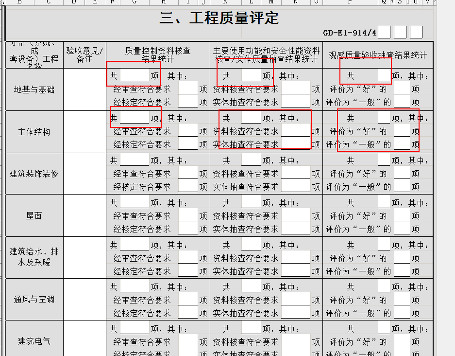 這張表是單位(子單位)工程質(zhì)量控制資料核查記錄、安全和功能檢驗資料核查及主要功能抽查記錄、觀感質(zhì)量檢查記錄的匯總表,需要根據(jù)這3張表進(jìn)行填寫。如圖: