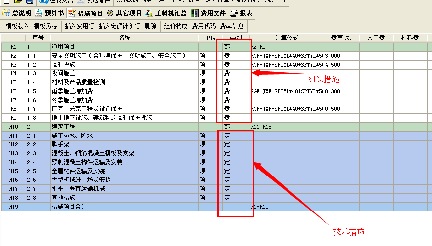 點(diǎn)開(kāi)措施項(xiàng)目界面,措施費(fèi)分為組織措施和技術(shù)措施,在軟件中措施項(xiàng)目里面,類別為“費(fèi)”的是組織措施,類別為“定”的是技術(shù)措施,如圖: