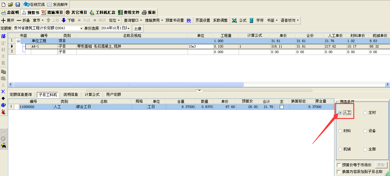 在子目工料機(jī)右邊有選擇項(xiàng),選中人工就可以了,如下圖