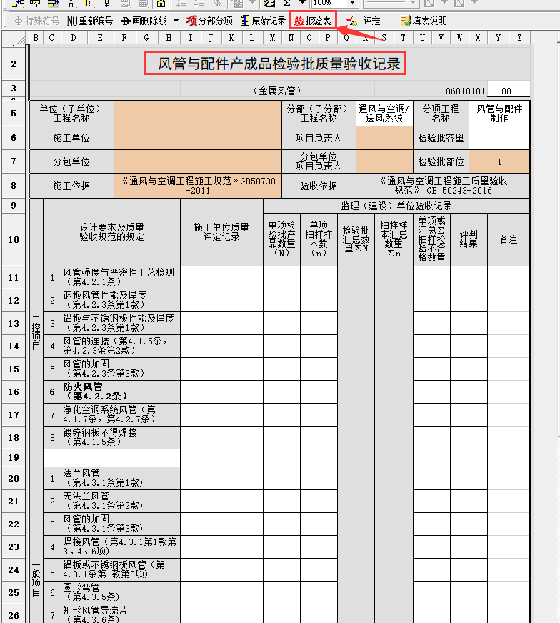 主管安裝選風管檢驗批,要注意不同材質(zhì)要選對應的材質(zhì)的檢驗批,報驗表在檢驗批表頭上方有個【報驗表】的按鈕,填寫完檢驗批以后直接單擊即可生成報驗表