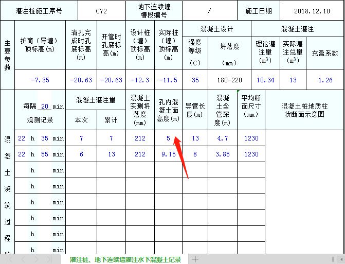 孔底標高減去每次觀測記錄時的孔內(nèi)混凝土面標高,它們的絕對值即為孔內(nèi)混凝土面高度