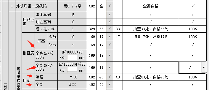 垂直度、標高從基礎(chǔ)開始就需要填,全高指的是這個建筑物設(shè)計高度,標高是每層澆筑完測本層的層高偏差,除此還要測全高的偏差