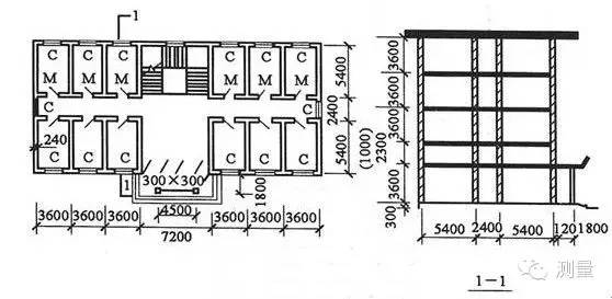 建筑面積=[(3.6×6+7.2+0.24)×(5.4×2+2.4+0.24)×5+(4.5+0.3)×1.83m