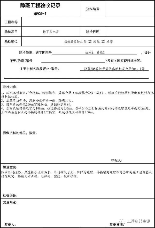 (2)填寫要點(diǎn):地下防水工程隱檢記錄中要注明施工圖紙編號(hào)、剛性防水混凝土的強(qiáng)度等級(jí)、抗?jié)B等級(jí),柔性防水材料的編號(hào)、規(guī)格、防水材料的復(fù)試報(bào)告編號(hào)、施工鋪設(shè)方法、搭接長度、寬度尺寸等情況,還應(yīng)將陰陽角處理、附加層情況等描述清楚,必要時(shí)可附簡圖加以說明。